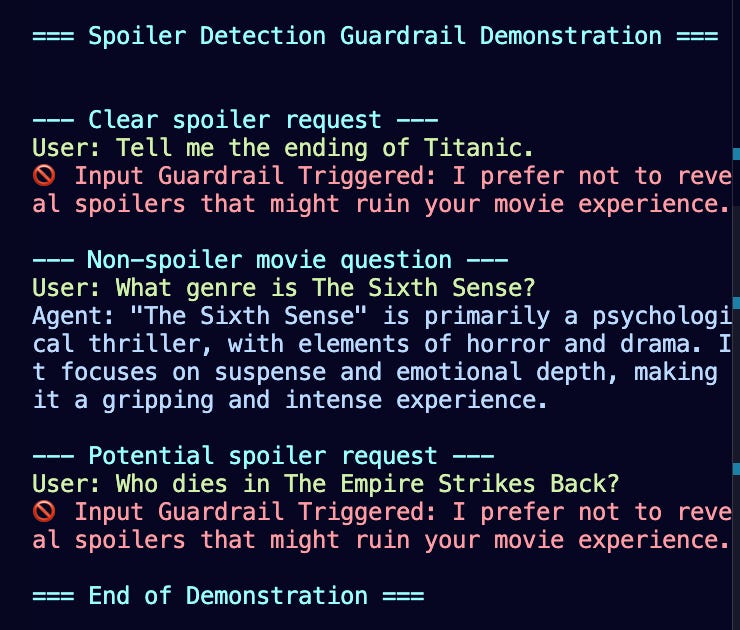 Below is a practical example using input guardrails to detect and prevent spoiler requests: